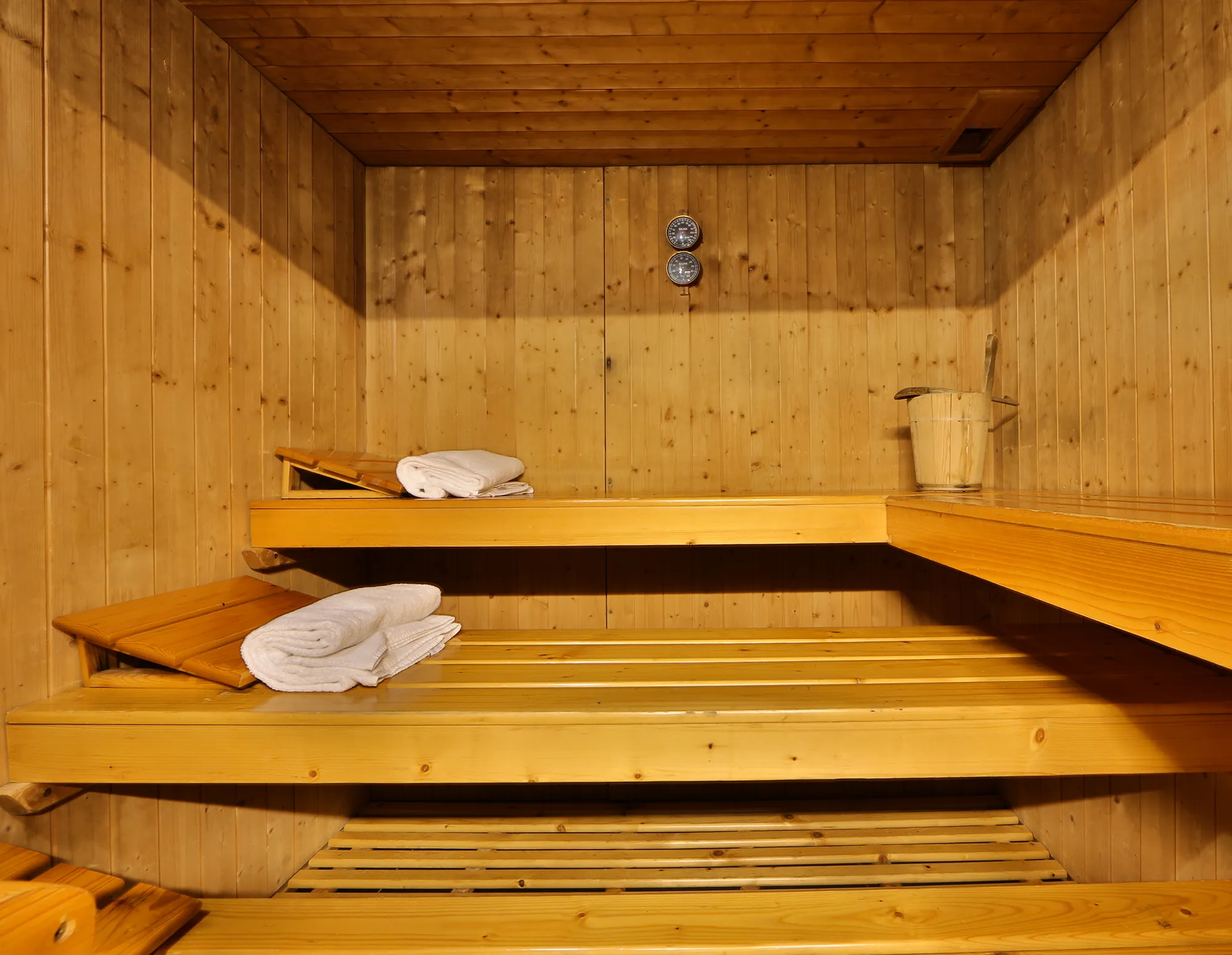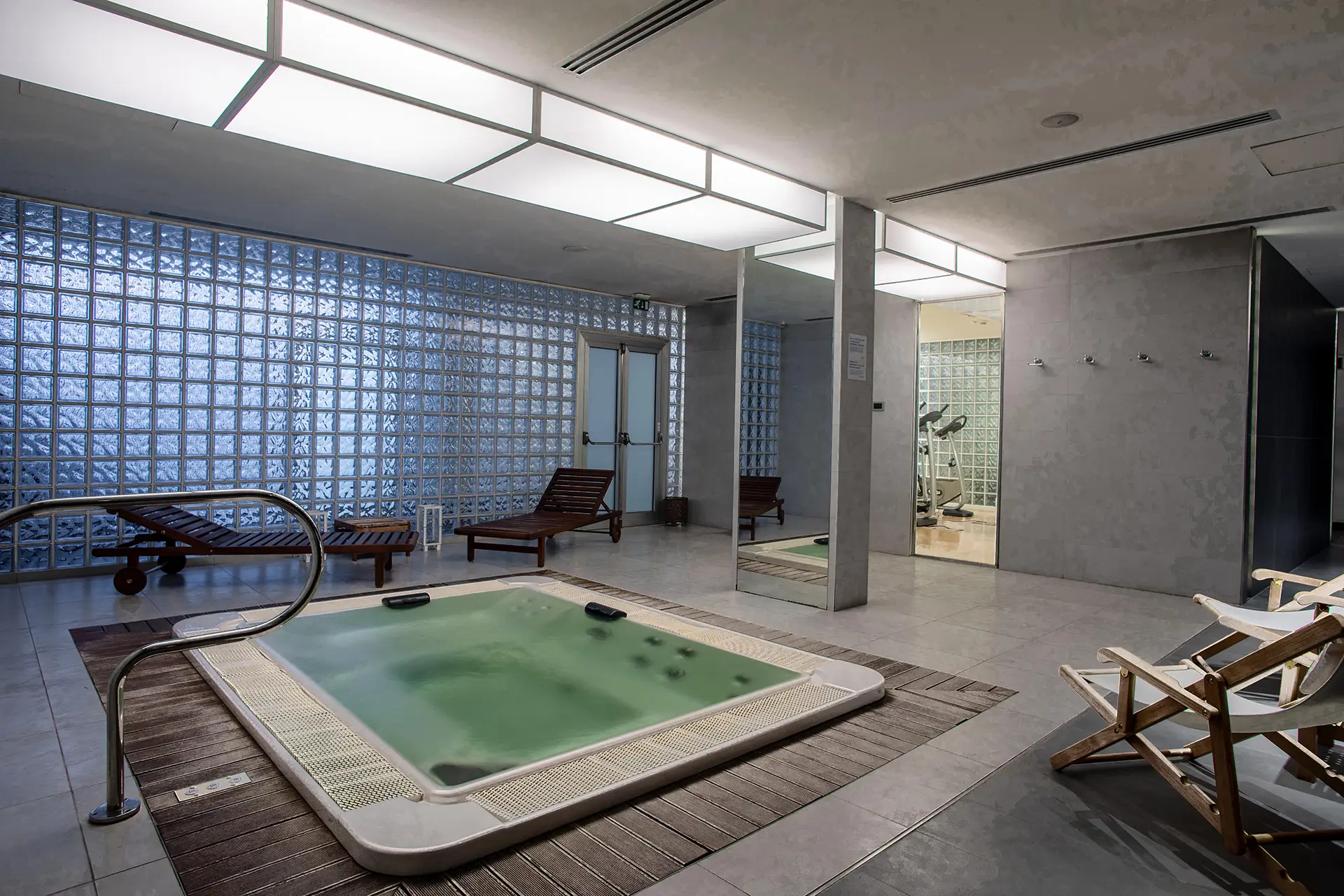 The area, more than 200 square meters in size, consists of a gym with Technogym equipment-including treadmill, elliptical, exercise bike, single multifunction bench, leg press-and a wellness area equipped with a sauna, steam room, and Jacuzzi.